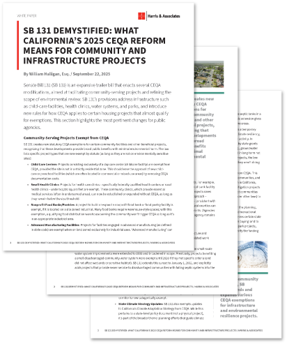 Senate Bill 131 (SB 131) is an expansive trailer bill that enacts several CEQA modifications, aimed at facilitating community-serving projects and refining the scope of environmental review. This section highlights the most pertinent changes for public agencies. For more information, download the white paper.